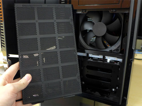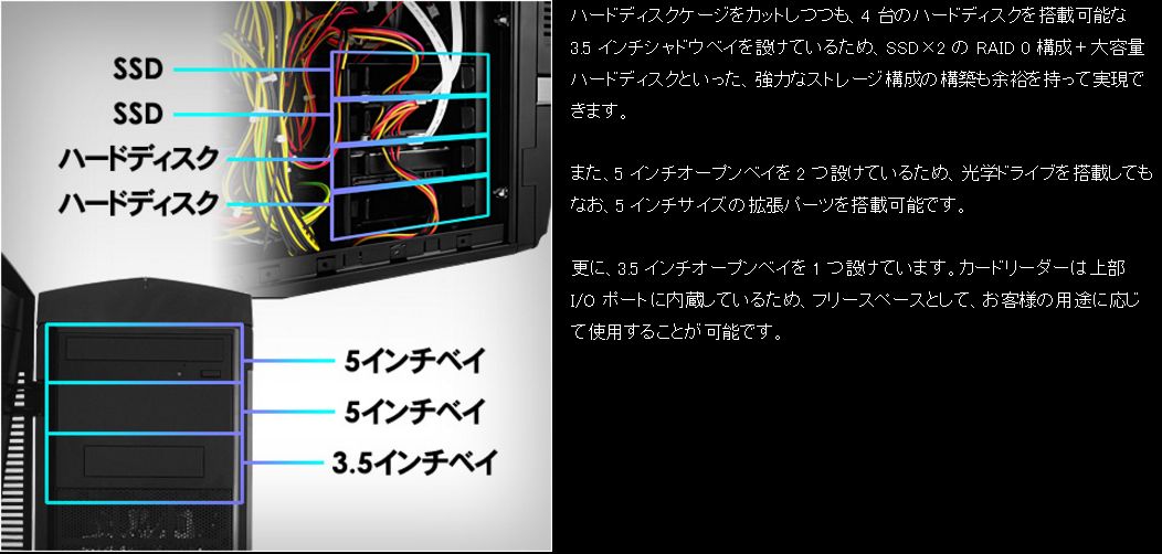 3.5インチ シャドウベイが4台あるのでSSD/HDDが最大4つ入る。5インチ オープンベイが2台あるので光学ドライブが最大2つ入る。さらに、3.5インチ オープンベイが1台ある。
