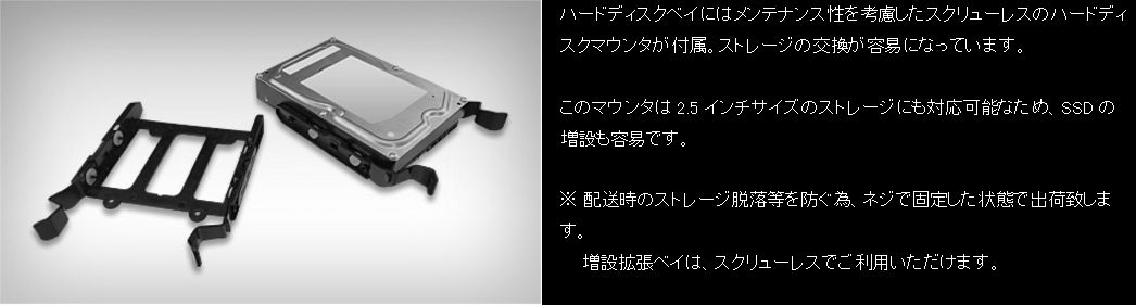 ストレージの交換はスクリューレス(ネジなし)なので簡単にSSD/HDDの交換ができる。