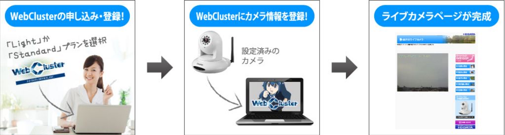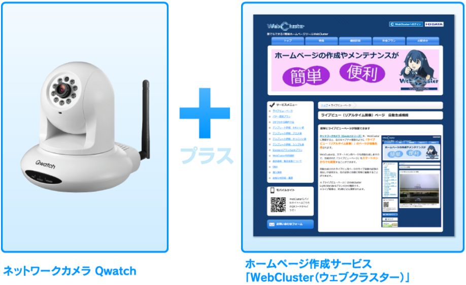 ライブカメラページの作成には、対応のネットワークカメラ「Qwatch」と、ホームページ作成サービス「WebCluster」の Light または Standard プランをご用意いただく必要があります。 WebClusterは直販サイト「ioPLAZA」にてお買い求めいただけます。